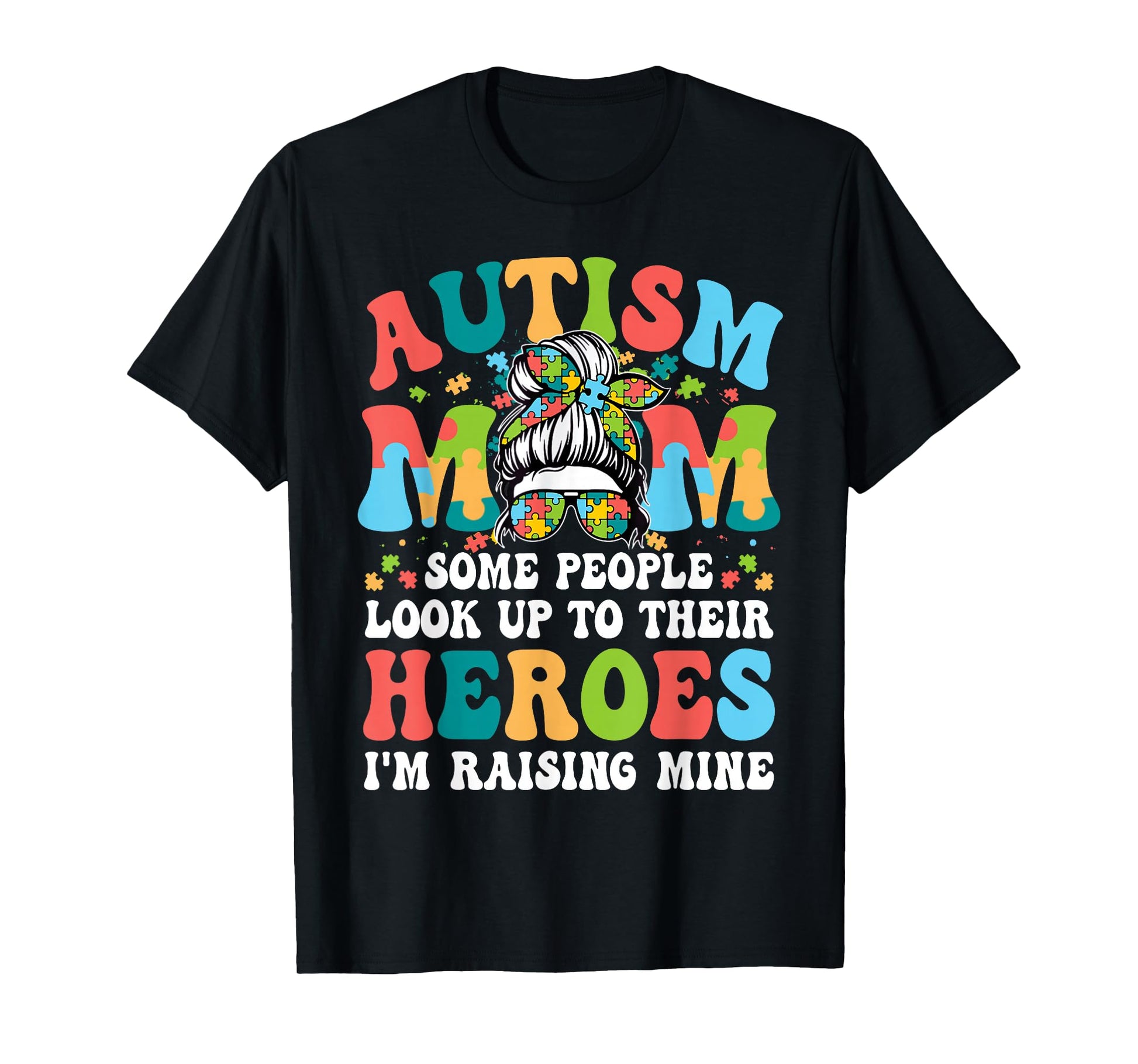 Autism Awareness Mom Raising Hero Messy Bun Puzzle Pieces T-Shirt