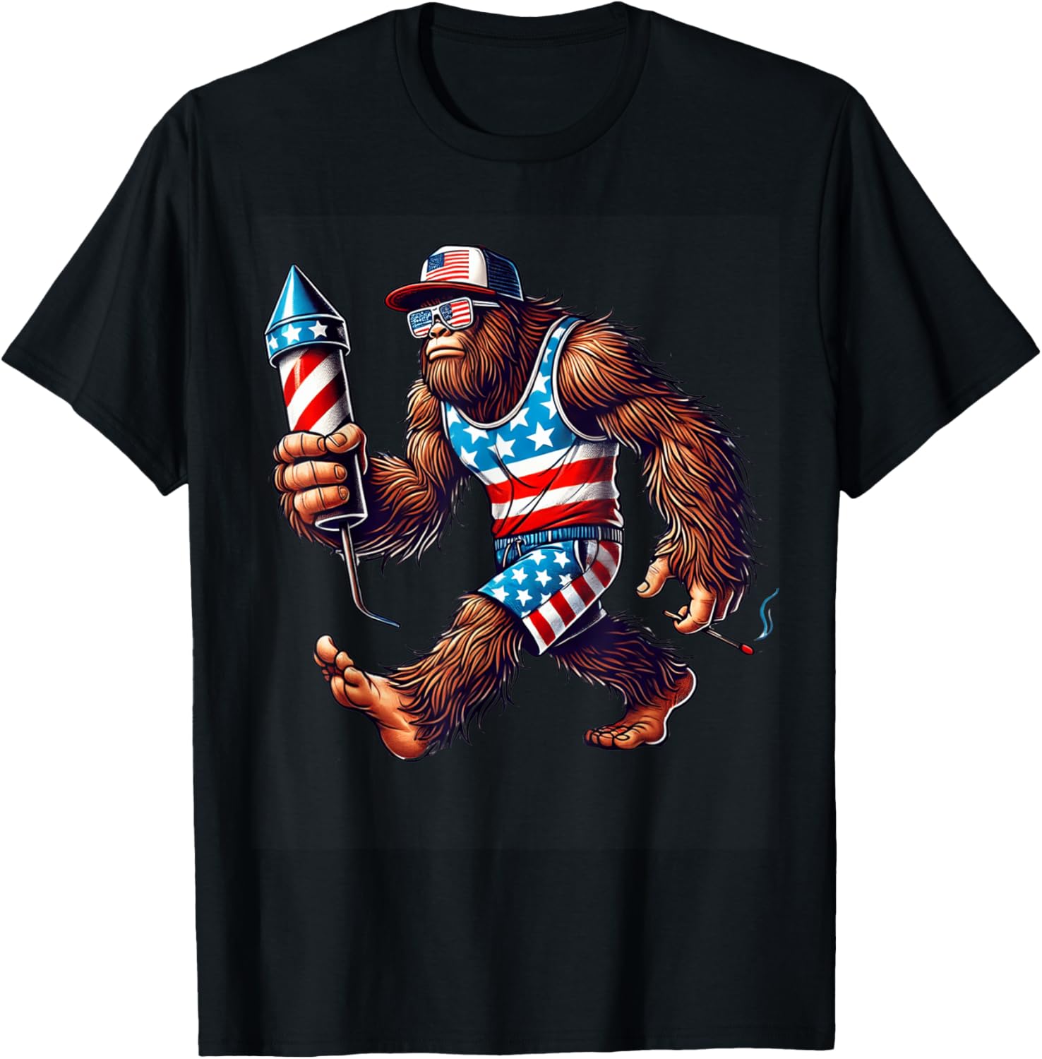 Bigfoot Fireworks 4th of July Men Sasquatch US Flag Men Boys T-Shirt