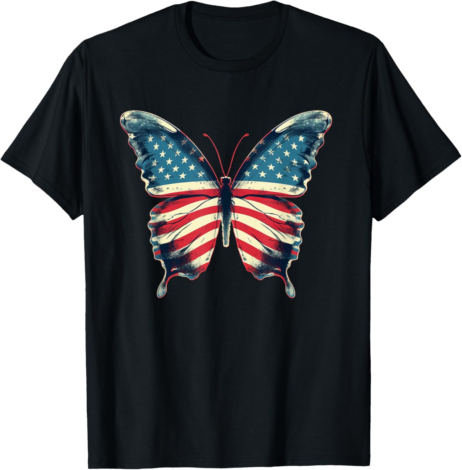 Butterfly USA Flag Vintage Cute American 4th Of July Girl T-Shirt