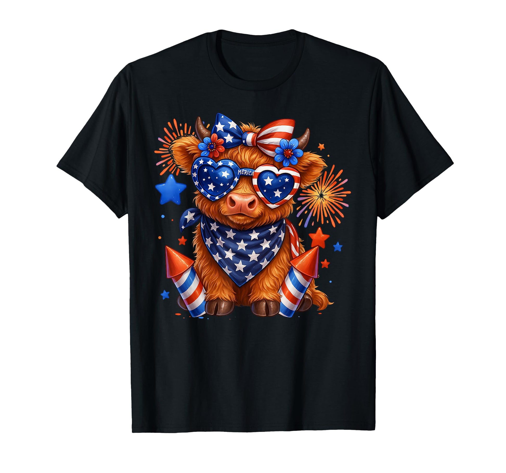Cute Highland Cow 4th Of July USA Flag Patriotic Cow Farmer T-Shirt