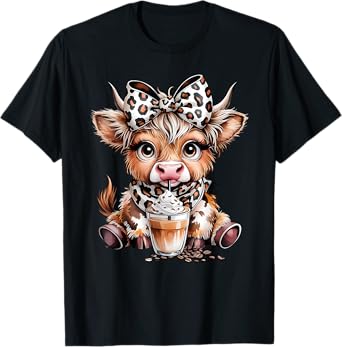 Cute Highland Cow Coffee Addict Funny Drink Coffee Cowgirl T-Shirt