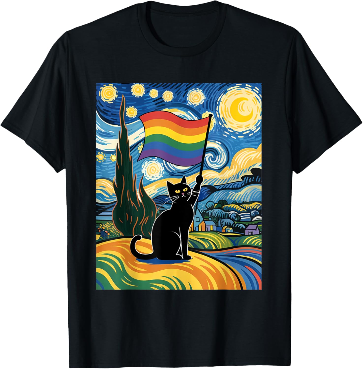Funny Gay Pride Cat Art Cat Starry Night Style LGBTQ Pride T-Shirt