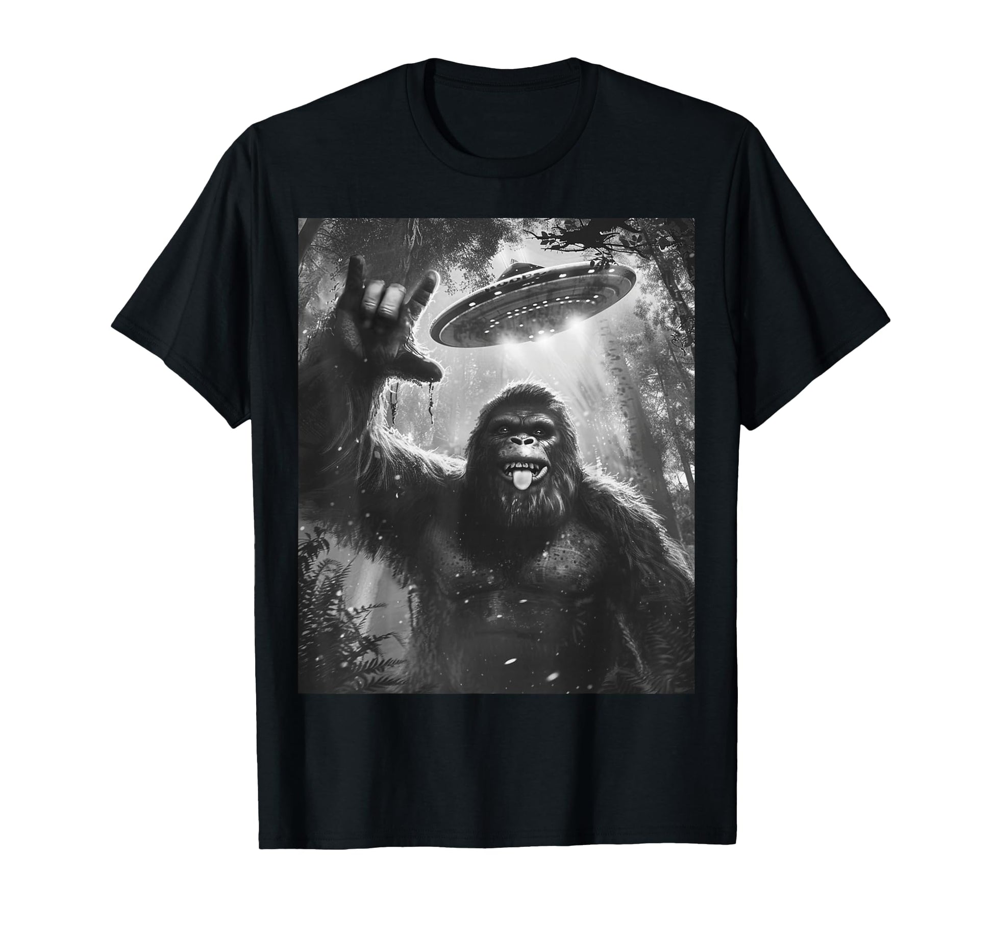 Funny Sasquatch Bigfoot Rock On Selfie with UFO Alien Saucer T-Shirt