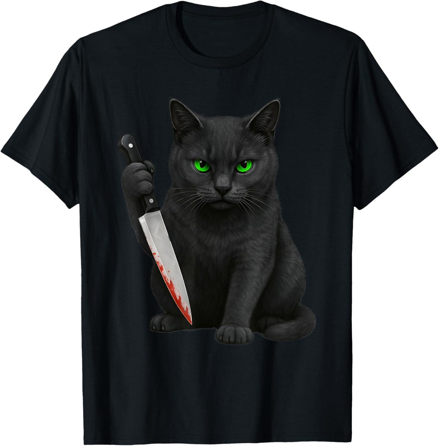 Halloween scary black cats funny kitty with bloody knife cat T-Shirt