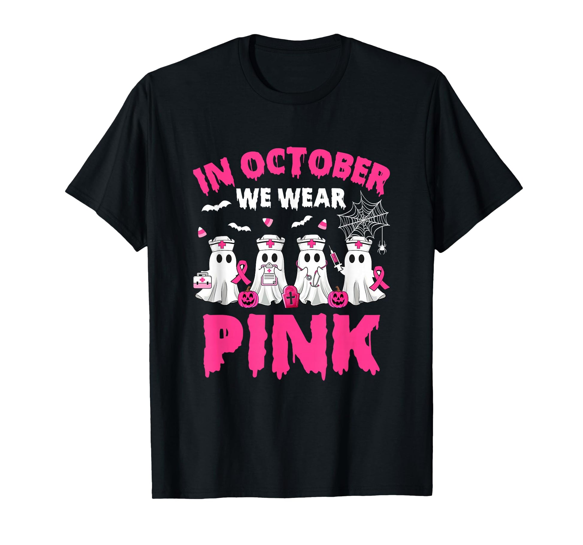 In October We Wear Pink Nurse Ghost Halloween Breast Cancer T-Shirt