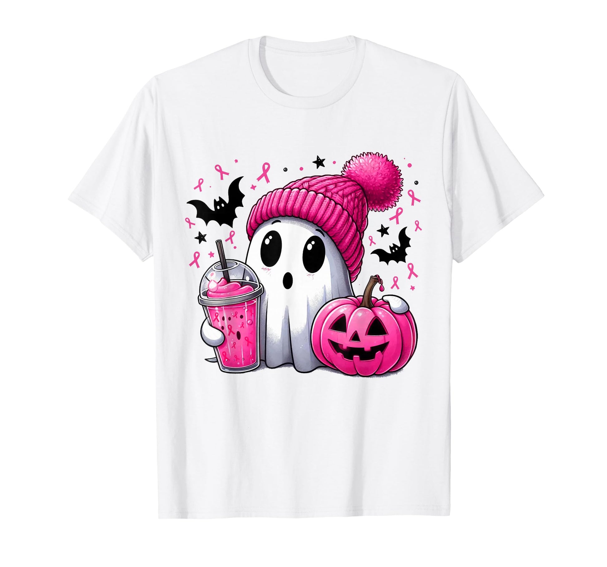 in October We Wear Pink Spooky Ghost Halloween Breast Cancer T-Shirt