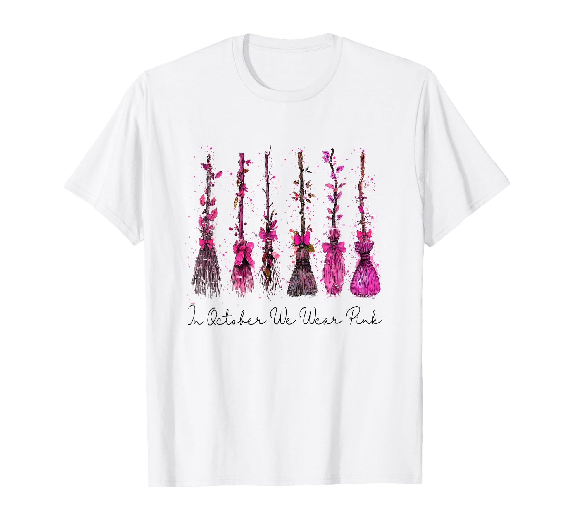 in October We Wear Pink Witches Brooms Spooky Breast Cancer T-Shirt