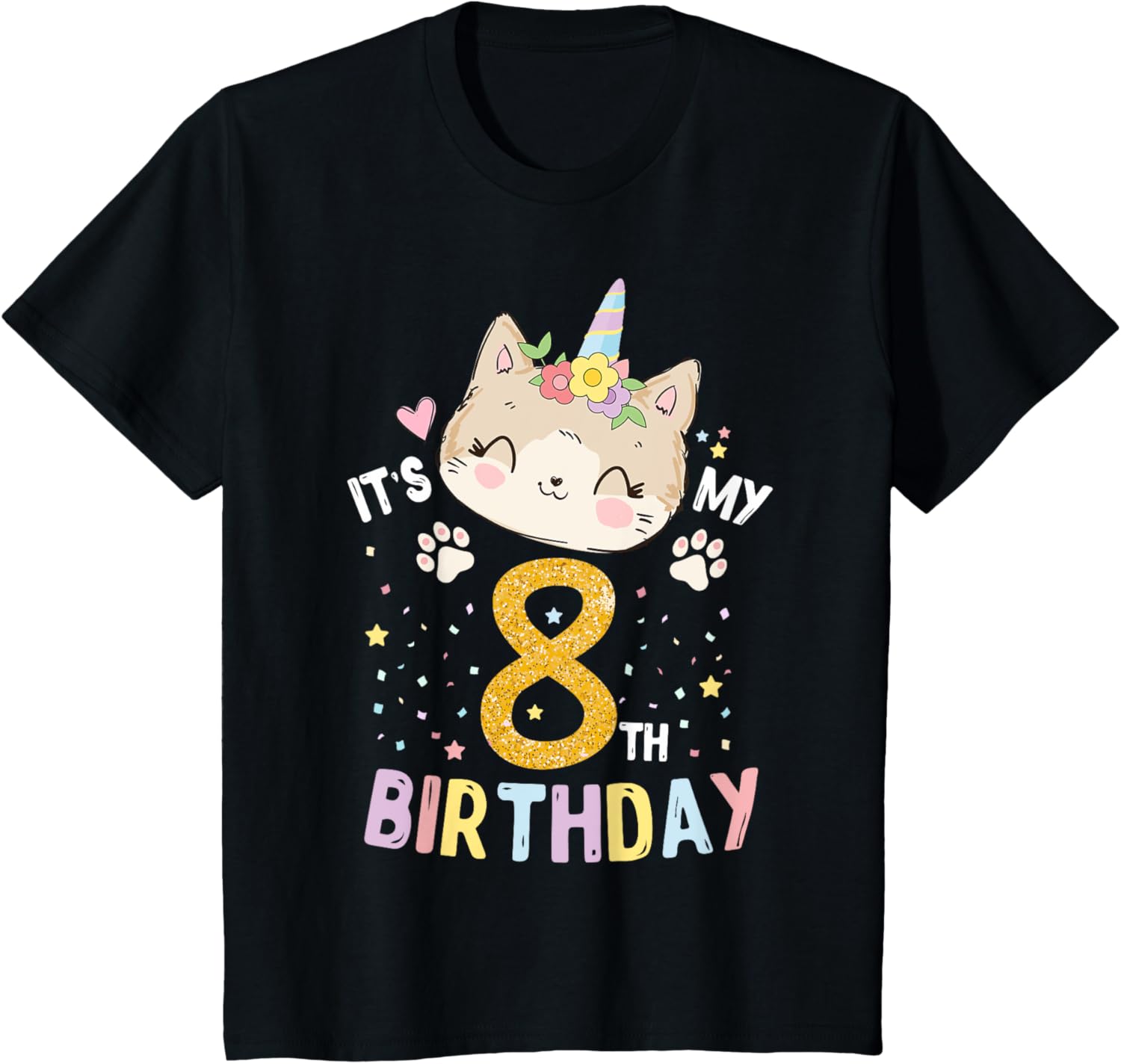 Kids It’s My 8th Birthday Cute Unicorn Cat 8-Year-Old Girl T-Shirt
