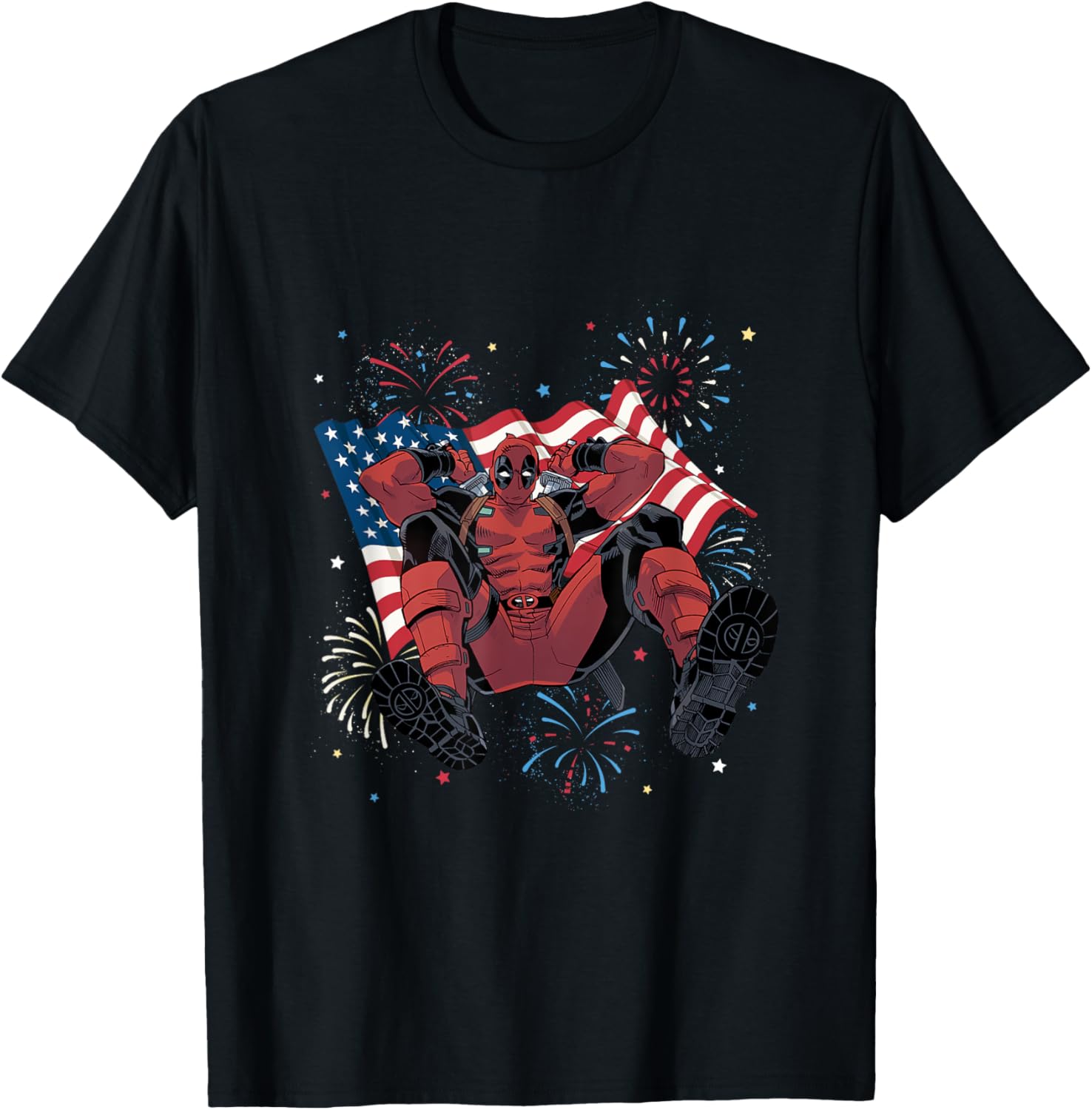 Marvel Deadpool 4th Of July Fireworks & Waving Flag Logo T-shirt