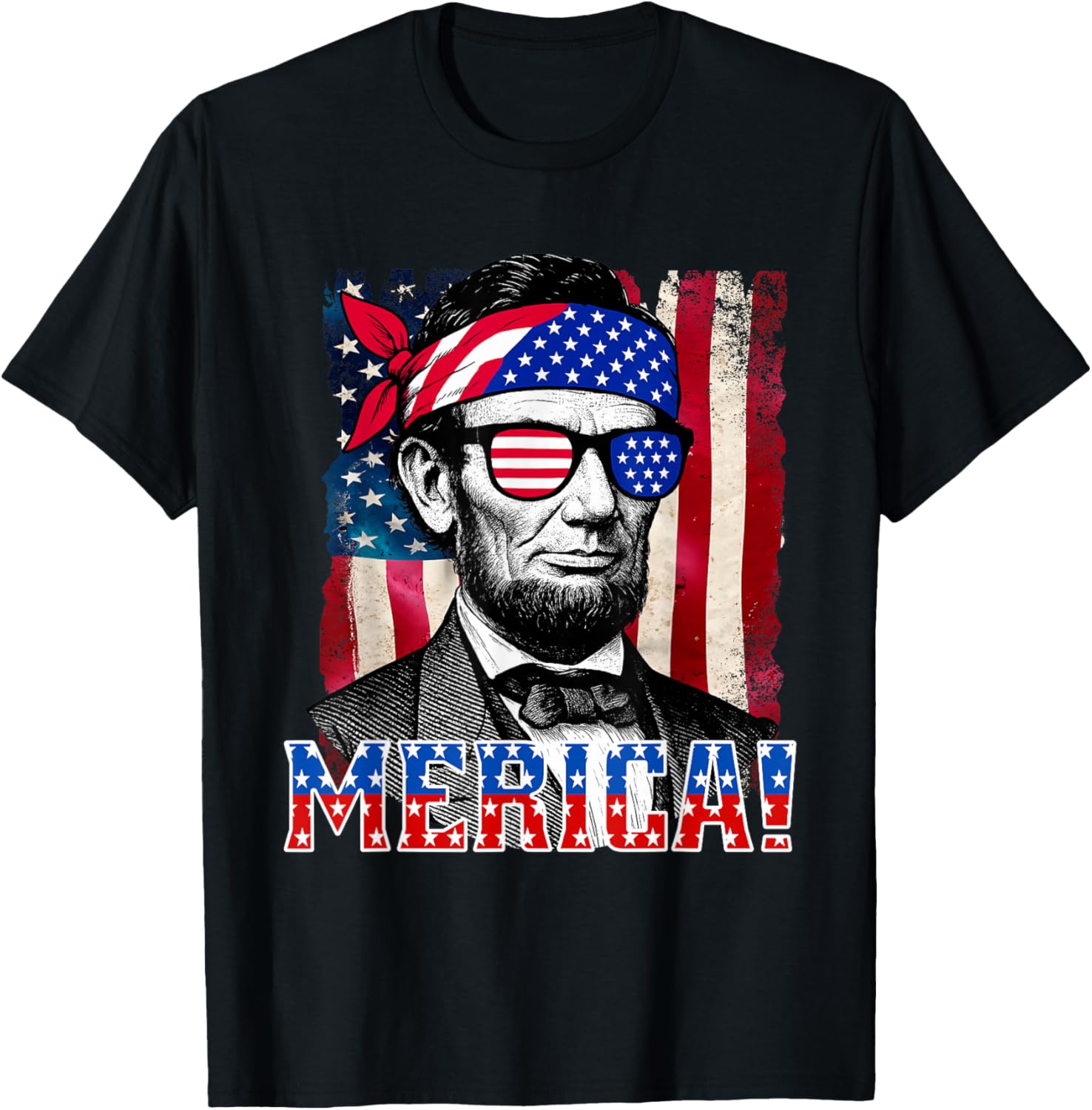 Merica Lincoln 4th Of July Abe Boys Men Women American Flag T-Shirt