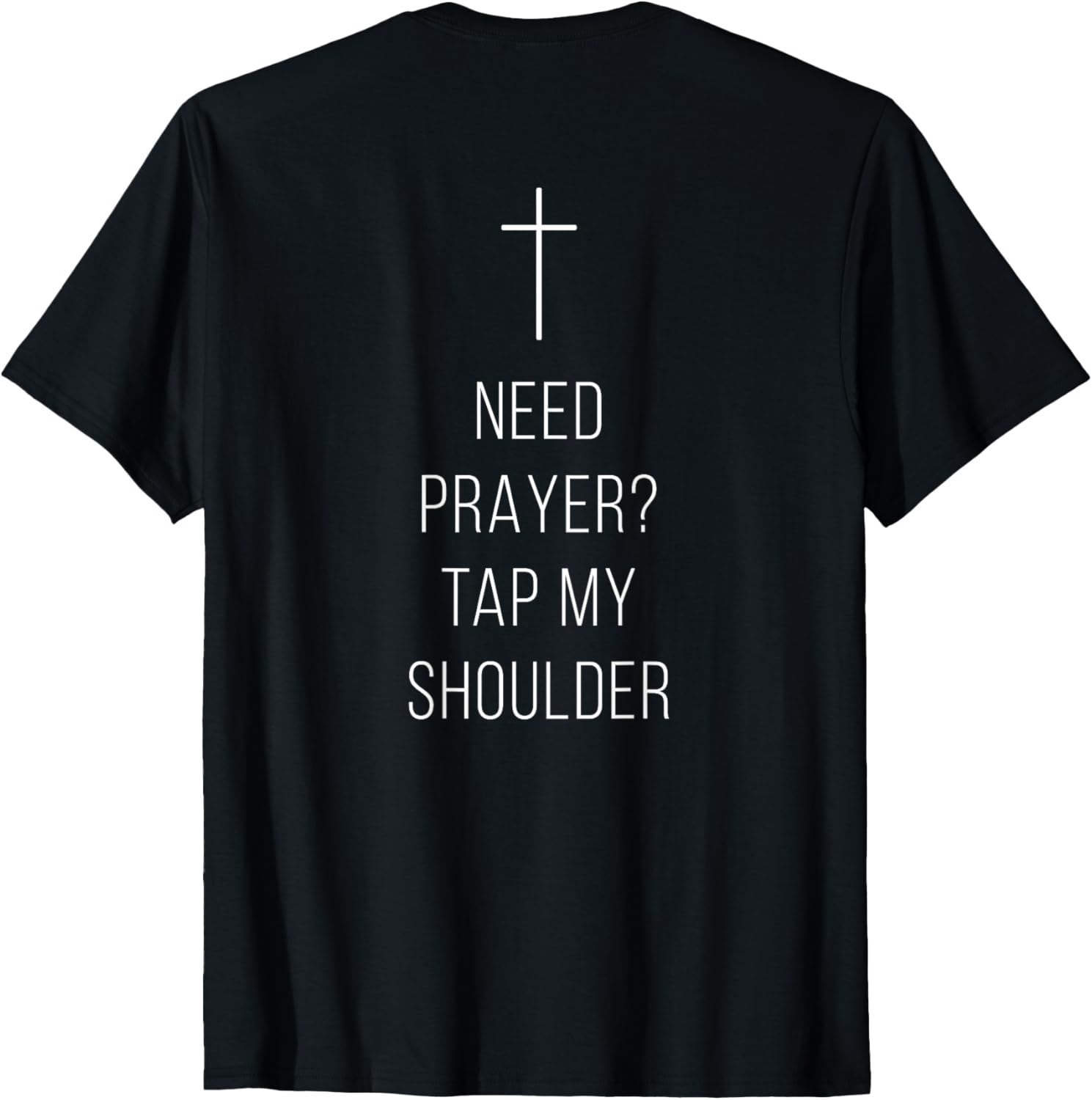 ON BACK Need Prayer Tap My Shoulder Christian Cross T-Shirt