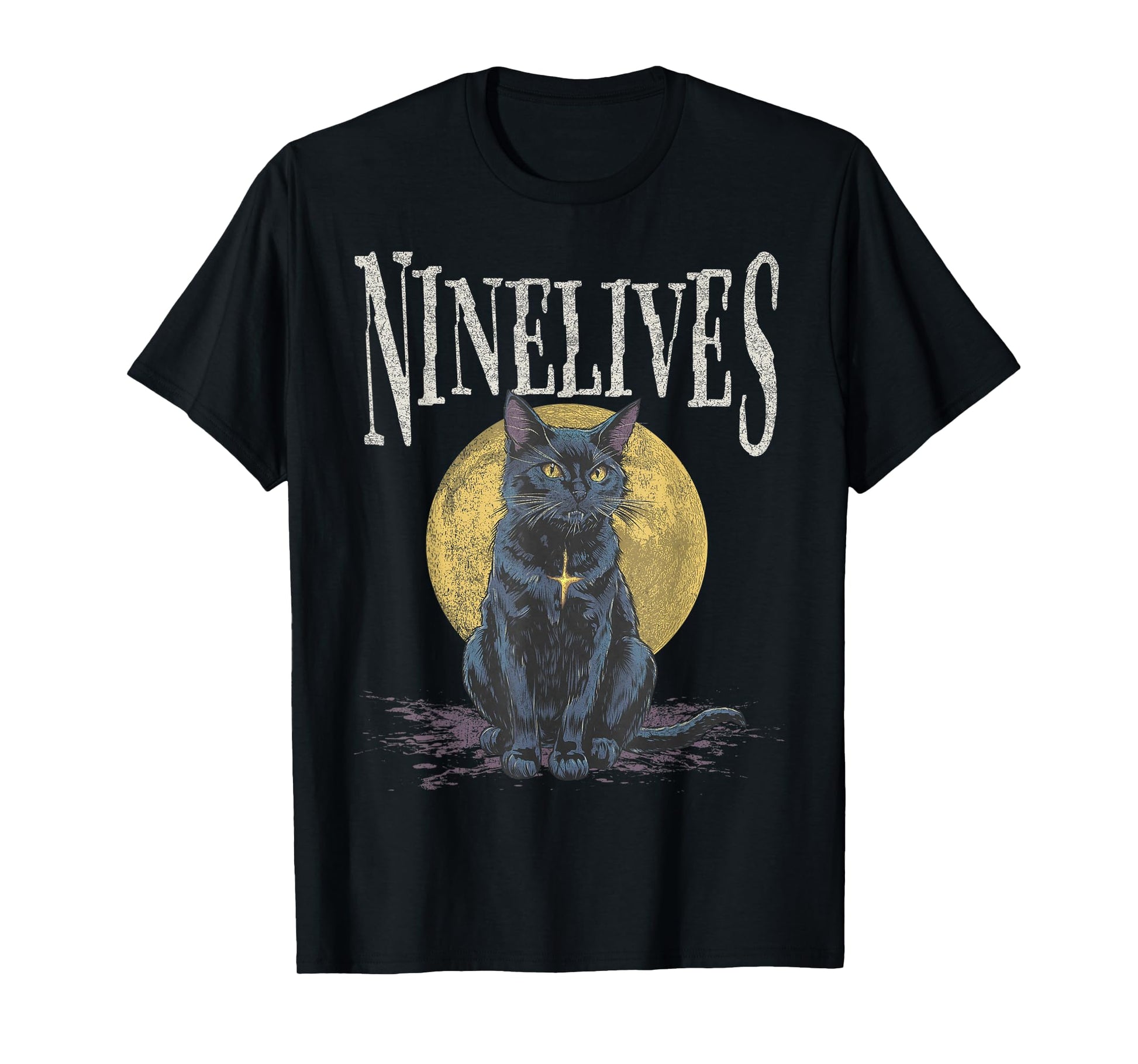 Vintage Retro Nine Lives Cat Moon Graphic Tee T-Shirt
